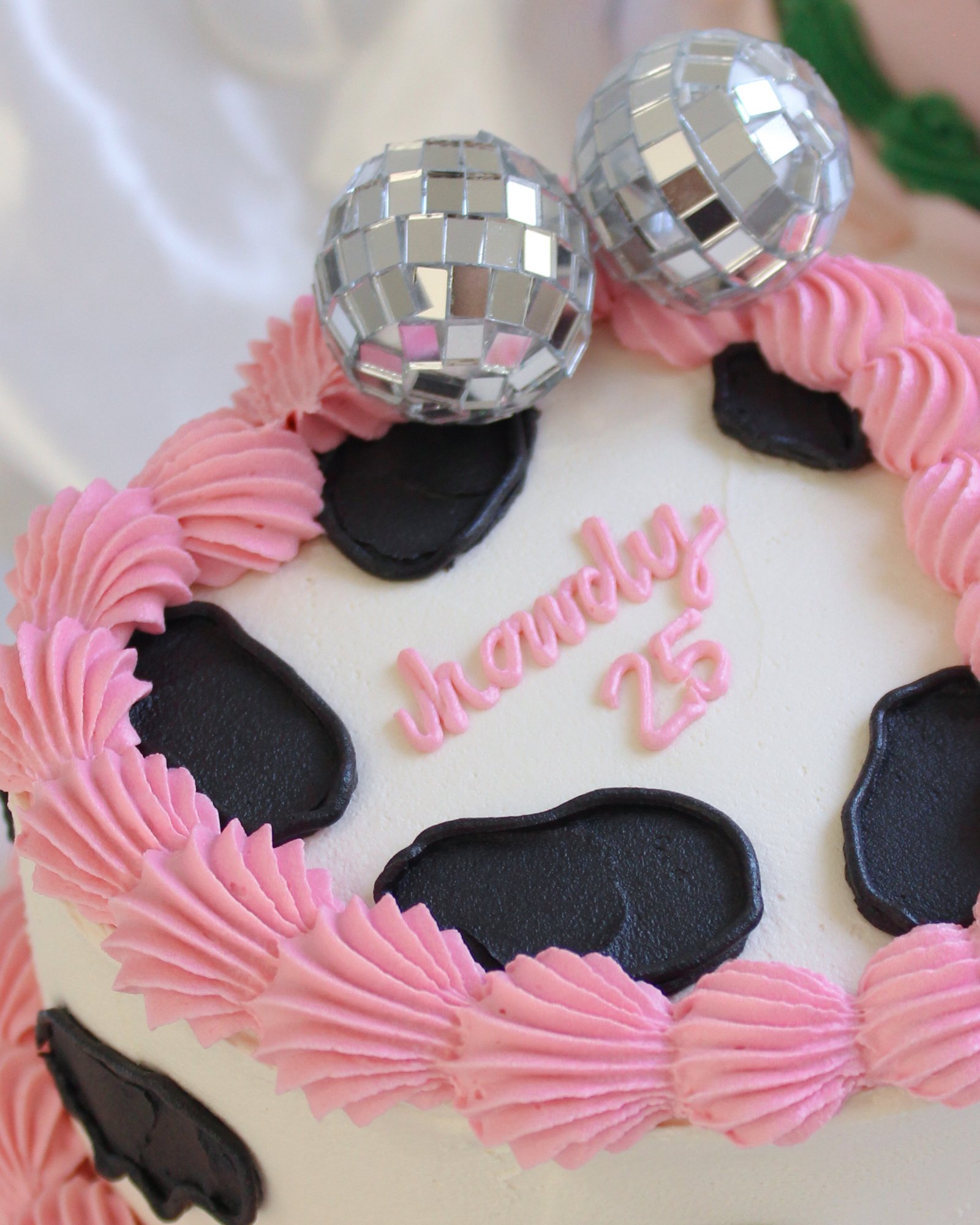 A funky blend of cow print, disco sparkle, and retro piping—perfect for birthdays, bachelorettes, or anyone born to boogie. Includes a heart shape cow print cake with a retro border, disco balls and matching text in your chosen colour.