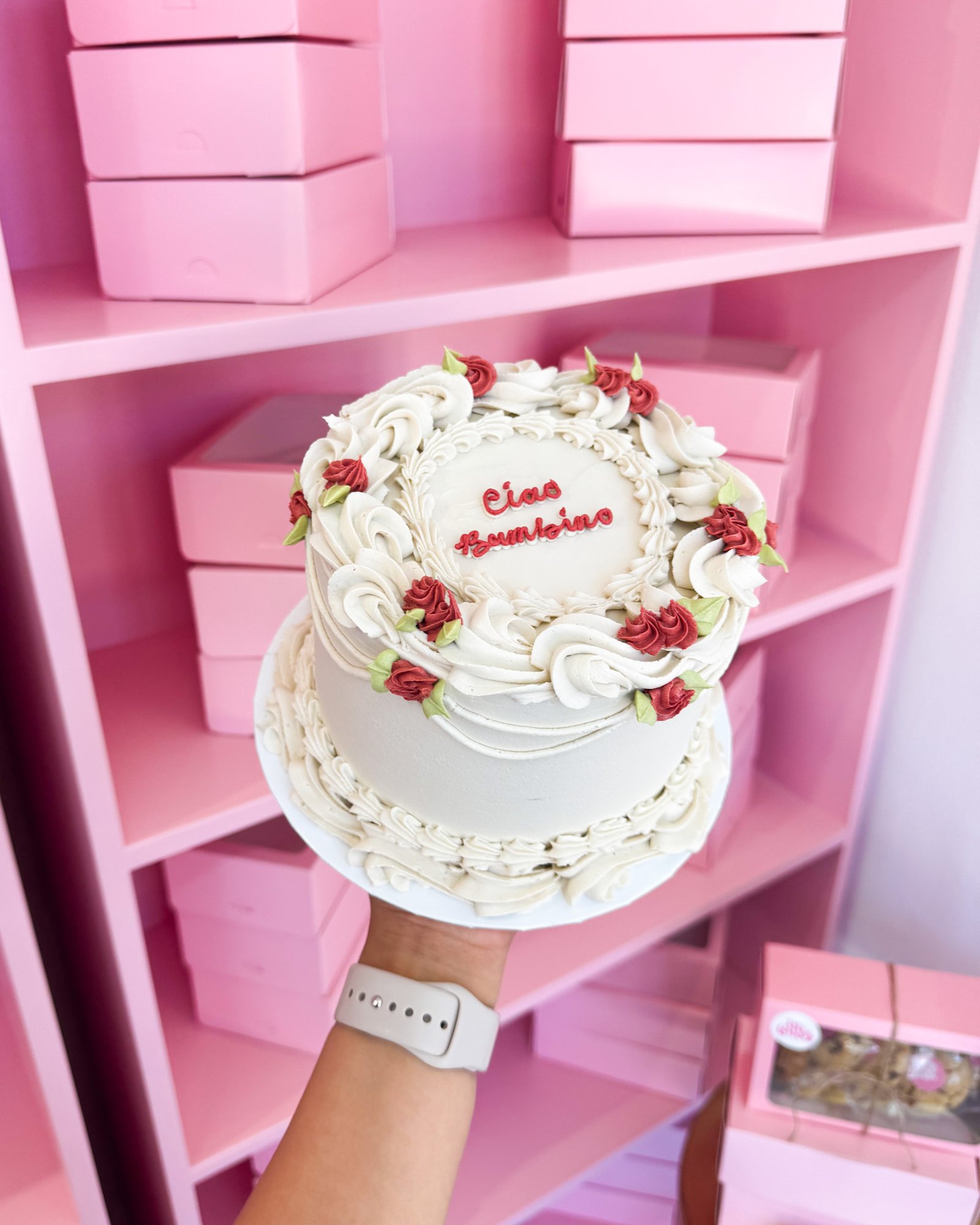 A charming retro-style cake adorned with intricate details and delicate mini roses. Clean, classic, and effortlessly pretty.