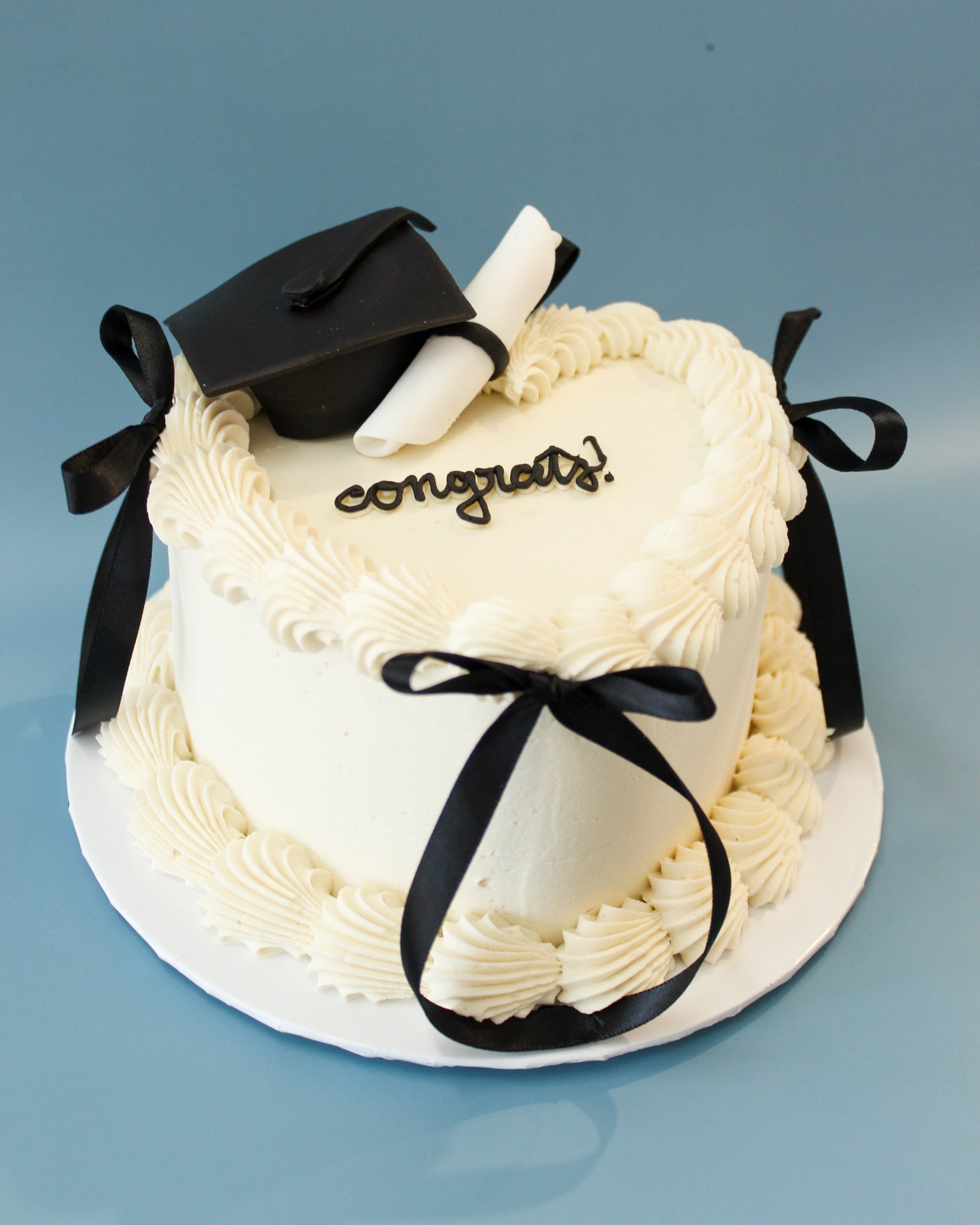 The Classic Ribbon Retro features delicate piping and ribbon loops for an elegant retro look, finished with a black grad cap and scroll and handwritten text.